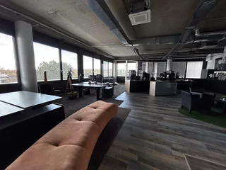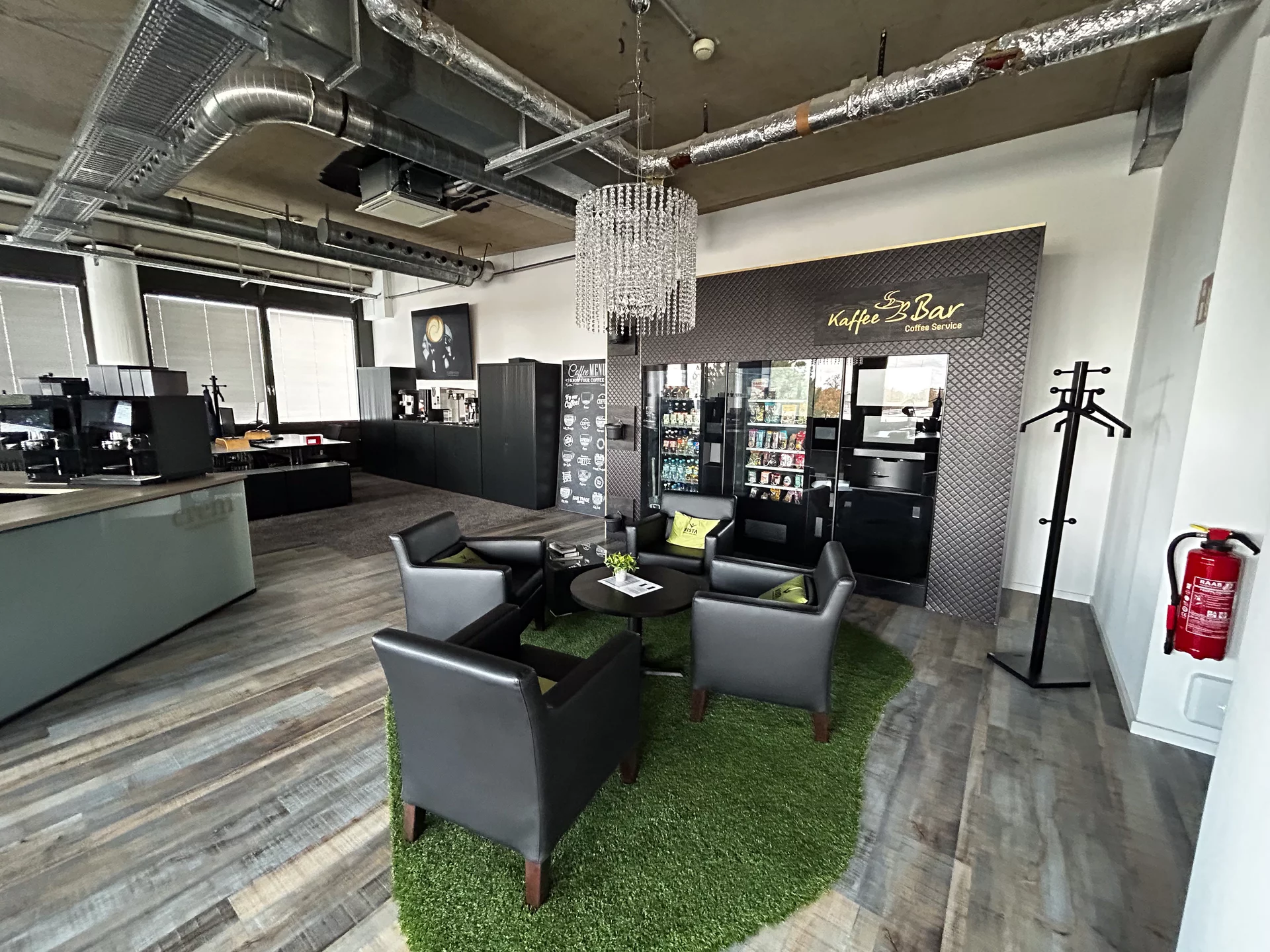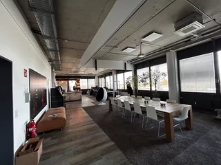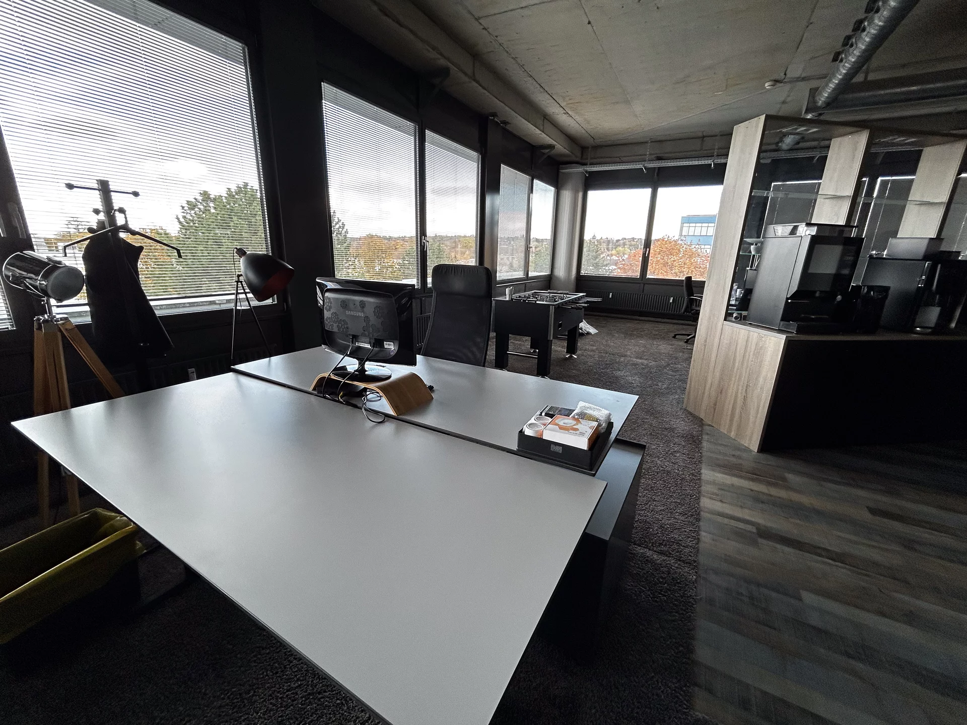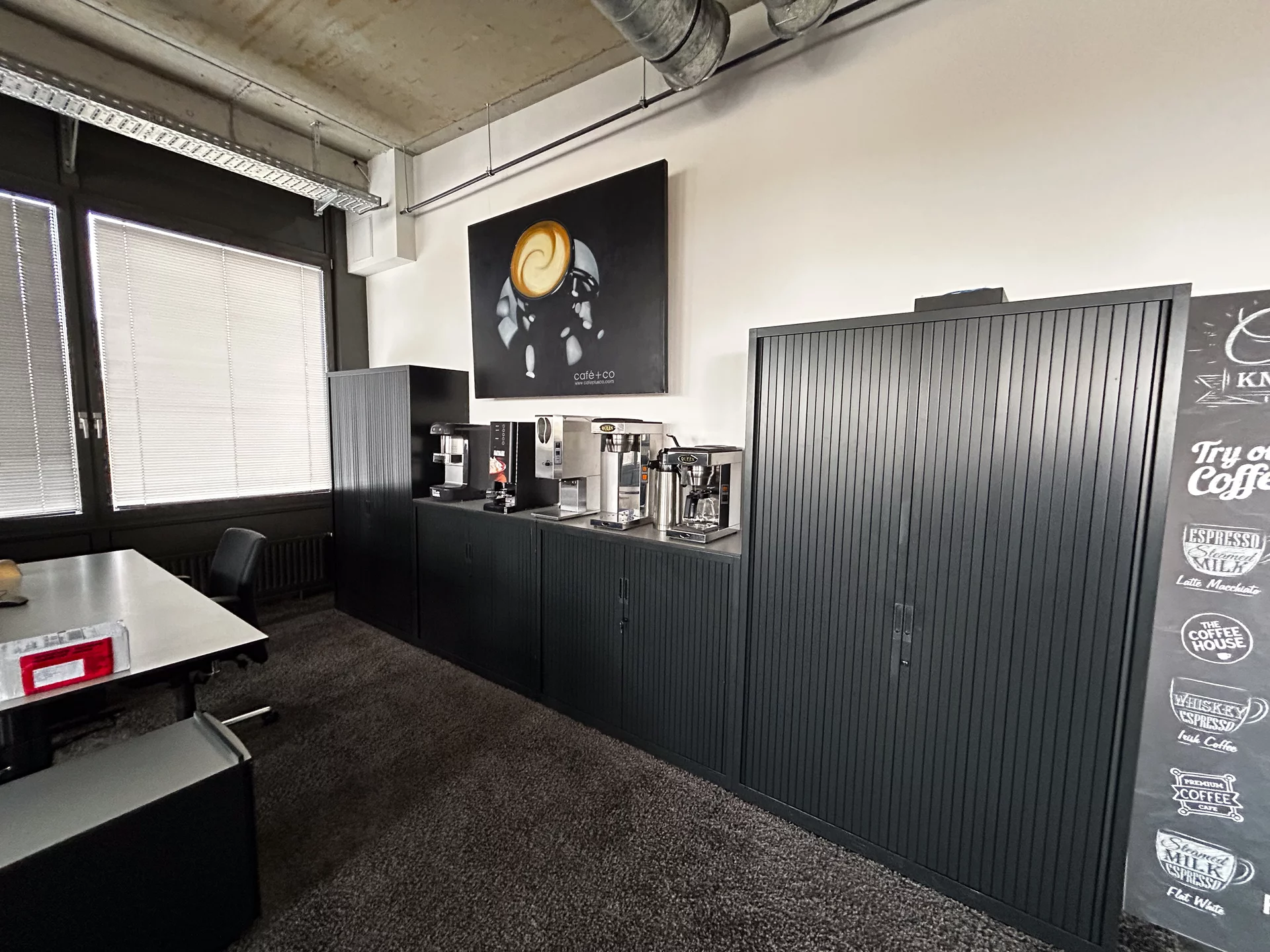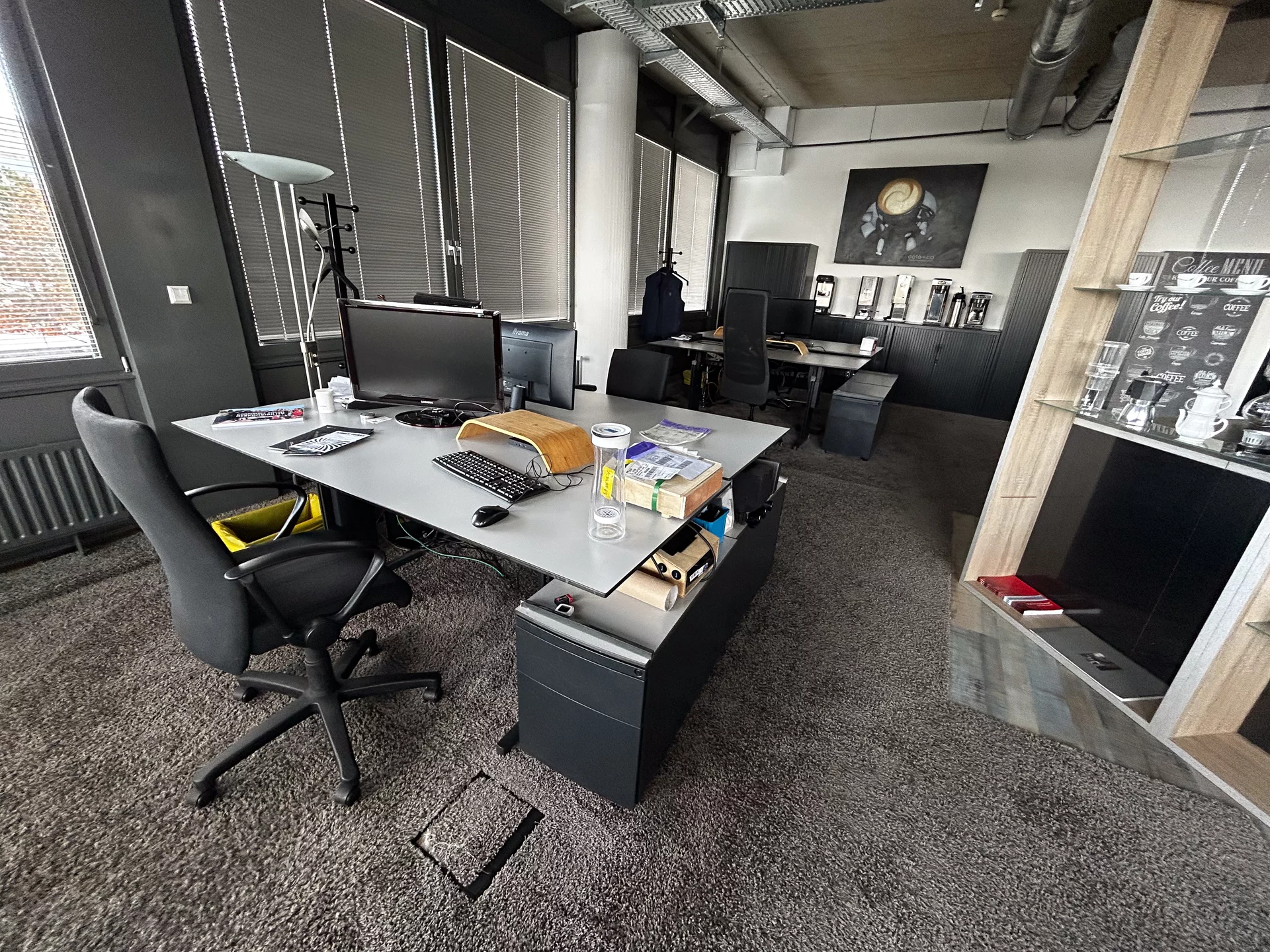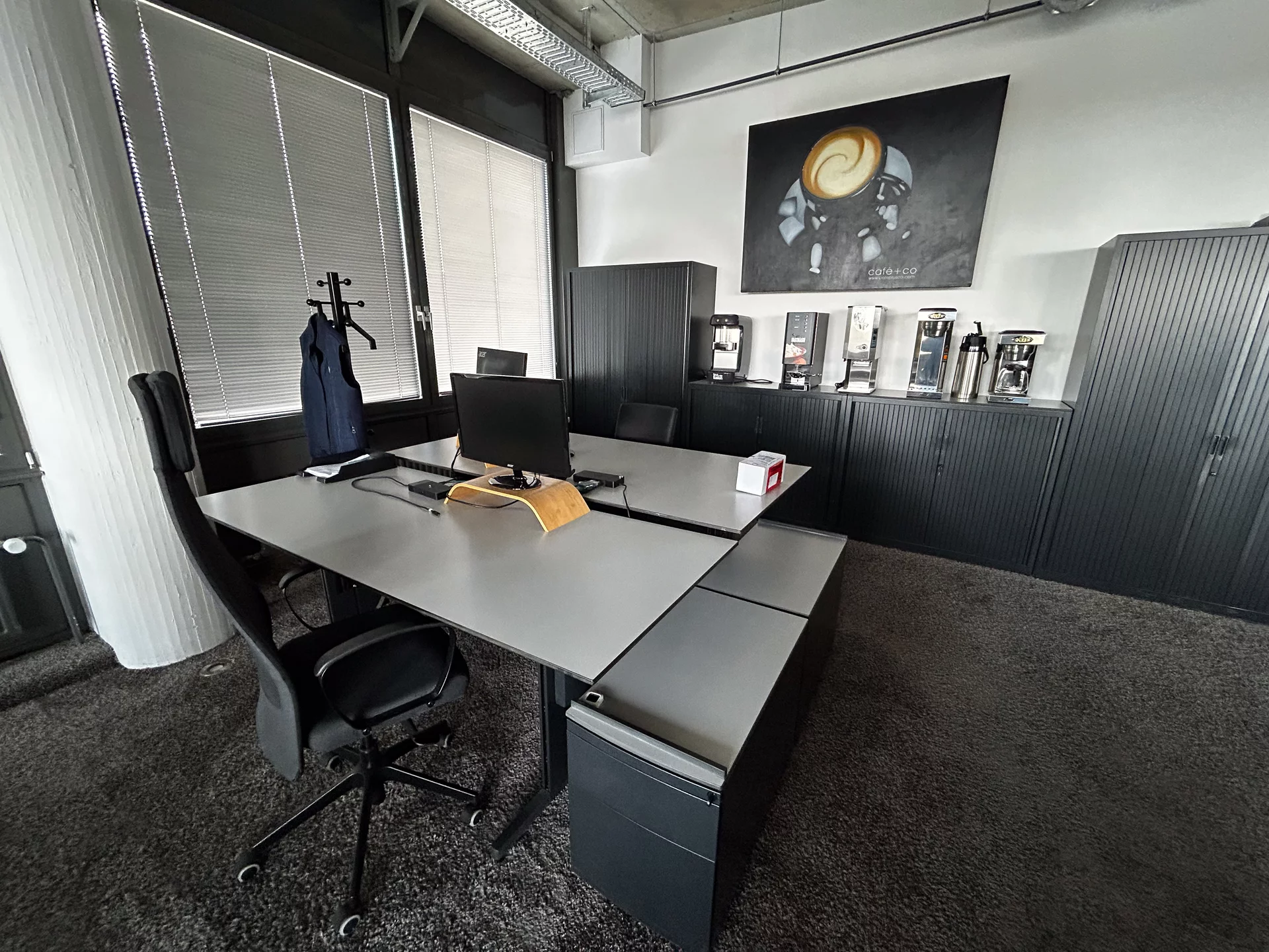 Das Loft-Ambiente mit sichtbarer Betondecke, stilvoller Industriearchitektur und hochwertigen Bodenbelägen verbindet Komfort mit zeitgemäßem Design. Unterschiedliche Arbeitszonen – von flexiblen Schreibtischbereichen über gemütliche Lounge-Ecken bis hin zu einem großen, einladenden Konferenztisch – bieten ideale Voraussetzungen für konzentriertes Arbeiten, Teammeetings oder kreative Workshops.